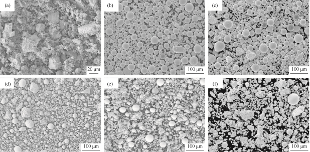 图2不同供给速率球化后钽粉的微观形貌:(a)原始钽粉;(b)10g·min-1;(c)20g·min-1;(d)30g·min-1;(e)40g·min-1;(f)50g·min-1