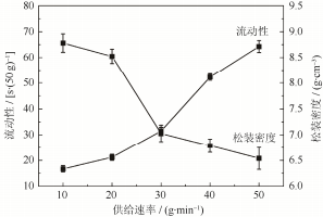 图4粉末供给速率对钽粉流动性和松装密度的影响