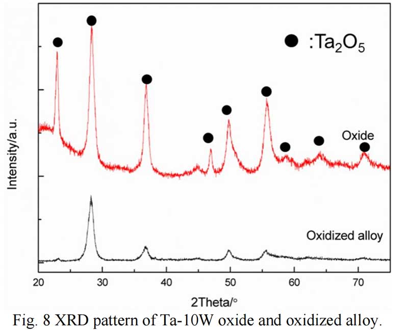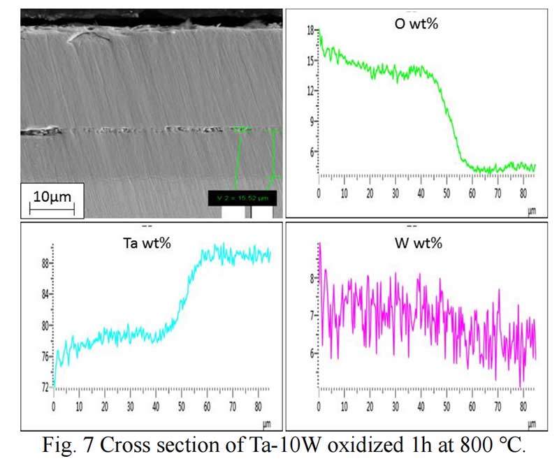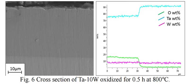 氧化物表征。图5为Ta-W合金在800 ℃氧化0.5h后的表面形貌。无论W含量多少,氧化生成的氧化层特征相似。氧化2h后,表面粗糙,易剥落。图6为Ta-10W在800 ℃氧化0.5h的截面图,可见氧化层较为致密,无孔洞。氧化产物中含有钽和钨,在氧化产物深处钽、钨和氧的浓度基本保持不变。EDS元素分析表明,氧化层中元素的重量百分比为Ta:W:O=76:8:16,原子百分比为Ta:W:O=29:3:68。氧化层的XRD谱图表明,氧化层中未发现钨的氧化物,而Ta2O5的峰位偏移表明WO3与Ta2O5形成了固溶体。氧化时间增加至1小时后,氧化层从基体上剥落,厚度为50μm,在基体表面(图7),观察到类似的灰色层,厚度约为15μm。元素分析表明,0.5小时剥落层的元素含量与氧化层相似。而在基体表面的氧化层中,Ta的浓度随深度的增加而增加,氧的浓度随氧化产物的厚度而降低。当氧化时间增加到2小时和4小时(见图9),剥落层碎裂成块,但仍然保留有厚度相当的氧化层。