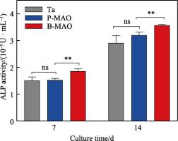 图 8 MC3T3-E1 细胞成骨诱导 7 、14 d 后 Ta、P-MAO 和 B-MAO 表面 ALP 活性( ns p>0.05,** p<0.01, n= 3 )