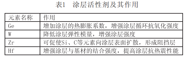 涂层主体材料选用Si-Cr-Ti混合粉料,在此基础上添加了一定量的金属单质粉料作为涂层活性剂,以改善涂层与合金基材的结合强度,改善涂层性能,主要的活性剂及其作用见表1。