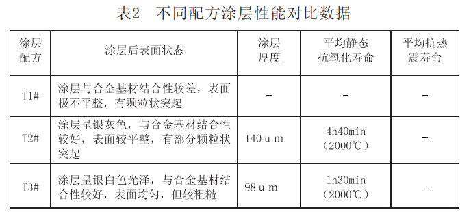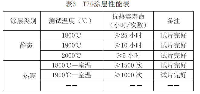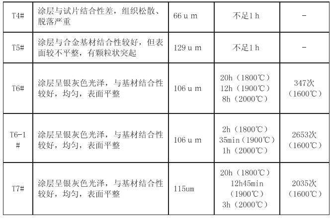 能满足设计要求,是目前所知的最适合Ta10W合金的高温抗氧化涂层。加制涂层后的Ta10W合金在大气下的静态抗氧化性能和抗热震性能非常好,高温抗氧化性能有大幅提高,后期对合金涂层进行了改进,改进后的涂层性能T7G涂层性能如表3。