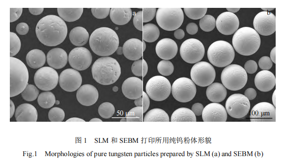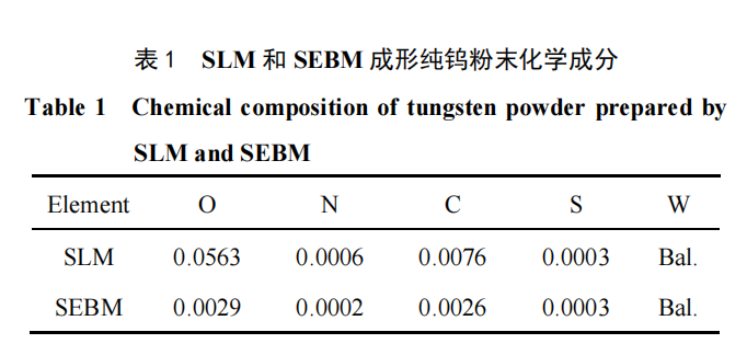 SLM 和 SEBM 成形的钨粉均采用球形粉末,但因 2种设备熔融能力和成形工艺特点的差异,其粒度分布有所不同。SLM 成形采用的粉末采购自四川自贡硬质合金公司生成的还原钨粉,经等离子球化处理,成为球形钨粉,粉体形貌如图 1a 所示,粉末粒径 D10、D50 和 D90分别为 5.3、11.5 和 25.0 μm。SEBM 打印设备需要使用更粗的粉末以防止成形过程中发生“飞粉”现象,粉体的形貌如图 1b 所示,其 D10、D50 和 D90 分别为52.4、81.1 和 123.0 μm。2 种钨粉的化学成分见表 1,纯度均大于 99.9%。