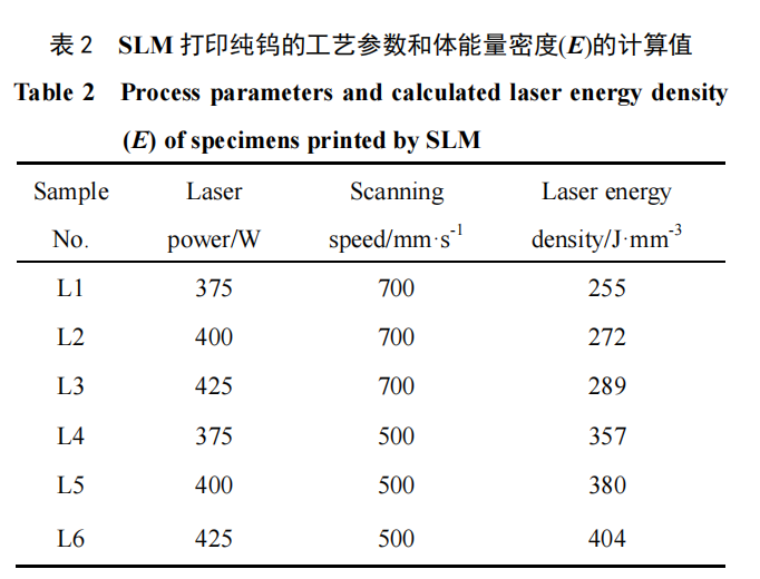 SLM 成形纯钨试验使用的设备型号为Farsoon271M,该设备激光波长为 106 μm,光斑尺寸为130 μm。试验用基材采用 316L 不锈钢板,打印前基板预热至 100 ℃。打印过程中充入氮气(纯度 99.9%)作为保护气氛,当环境氧含量低于 200 μL/L 时,开始激光成形纯钨试验,主要试验参数:扫描间距和层厚分别为70 和 30 μm,激光功率和扫描速度如表 2 所示。为了更好地评估工艺参数的影响,使用体能量密度 E 作为输入样品中能量多少的度量,E 的数值如下公式: