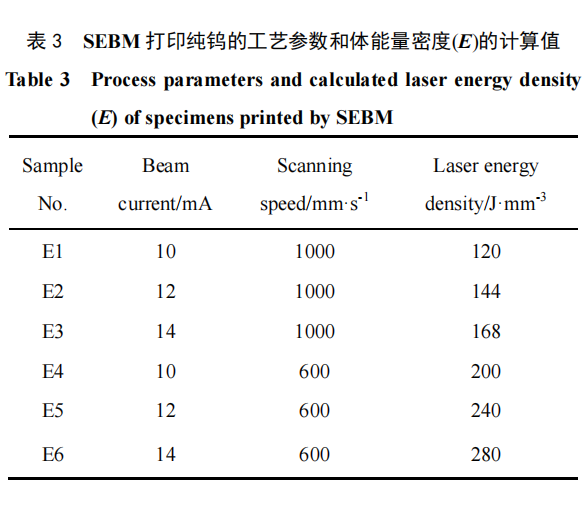 SEBM 成形纯钨用设备型号为 Sailong S2,电子束电压恒定为 60 kV,采用 316L 不锈钢板作为基板。打印前基板预热温度为 850 ℃。打印过程中抽真空至 1×10-4Pa,然后充入氦气(纯度 99.9%)至 0.01 Pa。表3 为电子束熔化纯钨的具体工艺参数和 E 的计算值。扫描铺粉层厚 50 μm,扫描间距 100 μm,体能量密度 E 的数值如下公式: