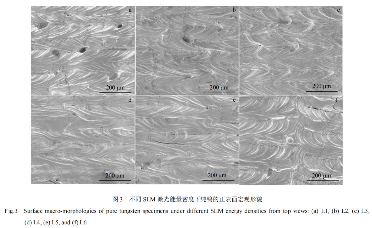 图 3 为不同激光工艺参数条件下纯钨 SLM 成形试样正表面(垂直于建造方向)的宏观表面形貌。可以看出,随着能量密度的增加,打印态样品的表面裂纹数量增加,孔隙缺陷减少。裂纹主要表现为横向裂纹和呈 90°方向的纵向裂纹,其中横向裂纹即打印的道与道的结合处。增材制造的纯钨材料往往有严重的热裂纹倾向,一方面是由于钨的韧脆转变温度较高,室温下呈脆性的特征;另一方面是因为 SLM 过程中的快速冷却速率和所造成的巨大的温度梯度。在激光打印过程中,层与层之间存在较大的温度差,冷速较快产生大的热残余应力,当脆性材料的残余应力逼近甚至超过材料本身的屈服强度时,会促使裂纹萌生并扩展[14,15]。试验结果表明,可以通过优化工艺参数和提高基板预热温度来降低打印样品中的温度梯度,从而减小热残余应力[16]。通常,随着激光能量密度的升高,熔池温度升高,温度梯度和热残余应力增加,产生裂纹倾向增大。