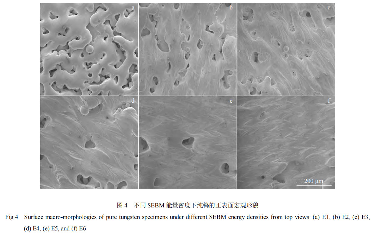 图 4 为不同能量密度下 SEBM 成形试样的表面宏观形貌。随着能量密度的增加,打印态样品的表面由存在大量空隙、连续条状或未熔化粉末颗粒的粗糙表面(图4a)变为较平整、光滑的表面(图 4d)。从图 4f 还可以看出当能量密度达到 280 J/mm3时,未熔合缺陷减少,球化现象减弱甚至几乎没有,成形试样表面显示出连续的扫描轨迹,组织均匀,说明由工艺参数调控对纯钨成形样品表面有较大的影响,适当提高能量密度将有利于纯钨 SEBM 成形。SEBM 打印过程是粉末熔体的扩散和凝固相互竞争的过程。熔融金属的扩散受其表面张力和动态粘度的影响,金属钨熔体具较高的表面张力和粘度,从而具有较差的润湿性和较慢的扩散速度[17,18]。熔融的钨液滴在毛细管力驱动下低速地润湿固态表面,而大的温度梯度又驱使其快速凝固,因此熔滴在完全扩散之前发生凝固,并保持球状形貌,而不是扩散后形成平坦的一层。当输入样品的能量增大时,熔池温度升高,溶液动态粘度降低,凝固所需时间也越长,这样液滴能够得到很好的扩散,铺展效果更好,形成光滑、平整的表面。