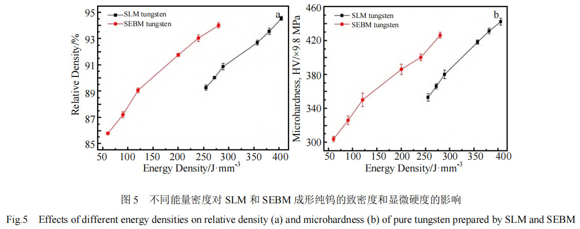 1) SLM 和 SEBM 成形纯钨的致密度和硬度与输入样品的能量密度呈正比例关系。SLM 成形纯钨的致密度最高达到 94.3%,硬度(HV)达到 4174.8 MPa。SEBM成形纯钨的致密度最高达到 94.75%,硬度(HV)达到4370.8 MPa。