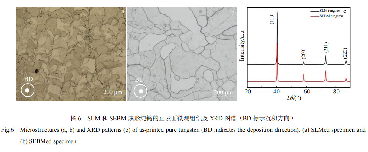 图 6 为 SLM 和 SEBM 成形纯钨样品正表面的微观组织及 XRD 图谱。同图 3 类似,从图 6a 中 SLM 打印态纯钨组织可看出,裂纹位于熔道与熔道的搭接处,微观上表现为晶界位置。晶界在协调变形过程中,由于自身抵抗塑性变形的能力较弱,更容易成为裂纹源。与 SLM相比,SEBM 制备的纯钨晶粒较大(图 6b),这是由于打印过程中基板温度保持较高,冷却速度较慢,提供给晶粒长大的能量和时间更充足。此时,SEBM 打印样品内部的热应力累积也较小,产生裂纹的倾向更小。由图6c 可知,SLM 和 SEBM 打印态样品中的物相均为纯钨,无钨的氧化物峰的存在。