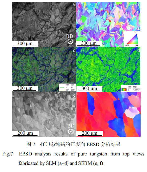 图 7e、7f 分别为 SEBM 打印态纯钨的 EBSD 结 果。计算可得出:SEBM 纯钨样品的平均晶粒尺寸为175.3 μm,小角晶界占比 98.7%,大角度晶界占比 1.3%。与 SLM 相比,SEBM 制备的纯钨的晶粒整体更粗大,小角晶界占比更多。小角度晶界能有效阻碍裂纹的进一步传播,而大角度晶界附近的应力较,易成为裂纹的来源,从而导致晶间裂纹。