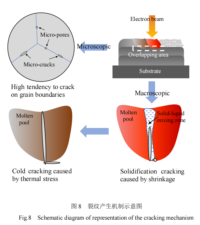 综合以上结果分析及现有研究学者的报道[14,15],构建出图 8 所示裂纹形成机制示意图,对增材制造制备纯钨样品内部裂纹萌生位置及产生的机制进行阐述。宏观上来说,纯钨样品的裂纹多萌生于搭接区域,块体试样的成形需要产生道或层的搭接,而搭接所产生的影响就是熔池存在 2 个方向的散热趋势:一是纵向通过基板散热;二是通过相邻已凝固的沉积层进行横向散热,造成横向的温度梯度。此时裂纹是凝固收缩过程中形成的,产生于凝固最后阶段的固液混合区,此时混合区的临近固相区的位置存在凝固缩孔,孔隙极容易产生局部的应力集中,因此更容易促进裂纹的产生[20]。随着凝固的进行,样品内部温度降低,纯钨在低温(200~400 ℃)下呈脆性状态,凝固过程中产生的热应力也会导致低温开裂。从微观的角度分析,裂纹具有沿晶界扩展的特征,这是由于液相填充的晶界速度赶不上凝固速度或者裂纹形成速度,随着凝固的进行,残余液相的液膜在热应力的作用下被撕裂,从而形成裂纹。