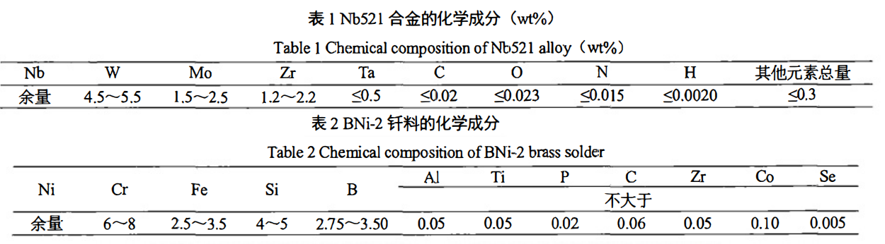 所用钎料为BNi-2。Nb521合金成分(表1),BNi-2钎料成分(表2),喷管身部表面有含O、Si、Cr、Nb、Hf等元素的涂层。