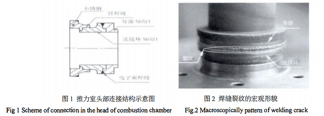 我所某型号推力室发动机推力室喷管身部材料为Nb521合金。不锈钢喷注器头部的连接是采用钎焊技术先将不锈钢与Nb521合金焊接起来,构成不锈钢/Nb521合金过渡连接环,再通过电子束焊接方法将连接环与不锈钢头部和喷管身部连接起来,从而完成发动机的组装,其结构示意,见图1。