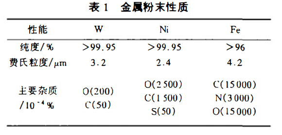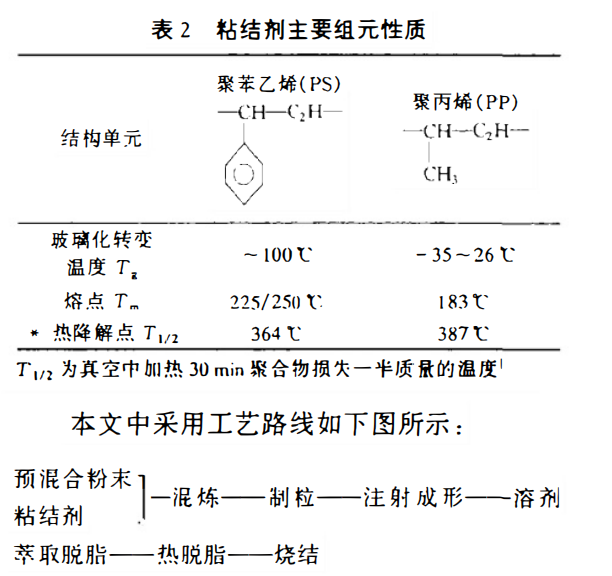 金属粉末采用W粉、Ni粉、Fe粉,其中W,Ni,Fe的质量比为97:2:1。粘结剂以聚苯乙烯和聚丙烯为主,另外添加少量活性物质。原料粉末和粘结剂性能分别如表1、2所示。