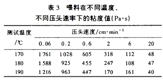 采用Instron 3211流变仪测定了喂料在不同温度和流变速率下的粘度值,毛细管直径为12.7mm,长度76.2mm,使压头速率变化,得到不同的负荷值,再换算成粘度,实验结果如表3所示。