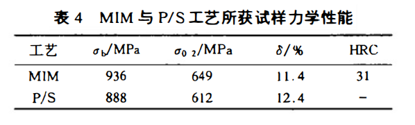 (1)MIM工艺过程中,由于提高了粉末分布的均匀性,消除了成形坯的密度梯度,使得合金表现出较好的力学性能,所达到的性能分别为ob=936MPa,co.2=649MPa,δ=11.4%,HRC=31。