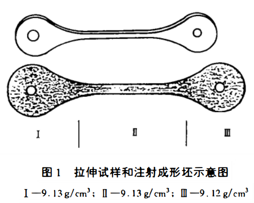 首先将W,Ni,Fe粉在V型混料器上预混合8h,然后将粉末与粘结剂混炼4h,粉末装载量为47.8%(体积分数);喂料经过制粒后萃取除掉聚苯乙烯,淬取时间2~3h,溶剂温度50℃;然后进行干燥、热脱脂和预烧结,整个过程约2~3h;最后进入钼丝炉中于1530℃烧结2h。采用了该工艺制备了两种零件,一是美国MIM协会标准拉伸试样,一是双头手枪弹后弹心。