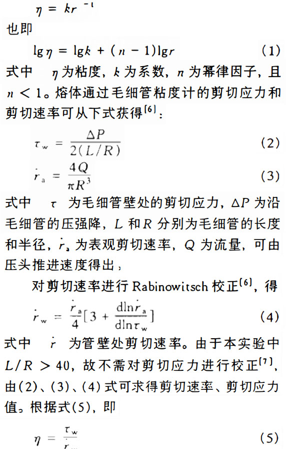 假定MIM喂料属于假塑性体。假塑性体的粘度-剪切速率关系可以用下式表达。