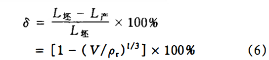 式中 δ为收缩率;Lx为成形坯尺寸;L=为产品尺寸;V为喂料中粉末的装载量;p,为产品的相对密度。