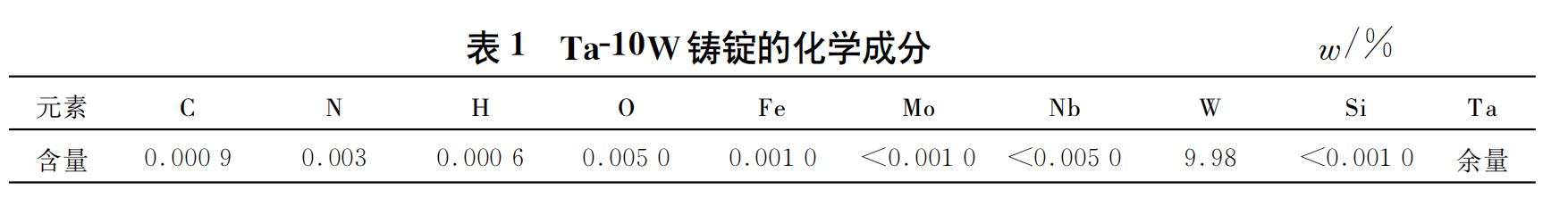 Ta-10W合金铸锭的制备流程可简要概述为:钽粉+钨粉→混合→等静压成形→真空垂熔烧结→电子轰击熔炼→D100mm Ta-10W 铸锭所得铸锭的晶粒较为粗大其表面晶粒尺寸平均为4~6mm?铸锭化学成分分析结果见表1。