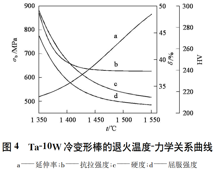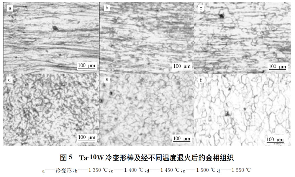 (2)Ta-10W 合金挤压棒经总加工率为78%的冷变形后,其再结晶退火温度为1450℃。