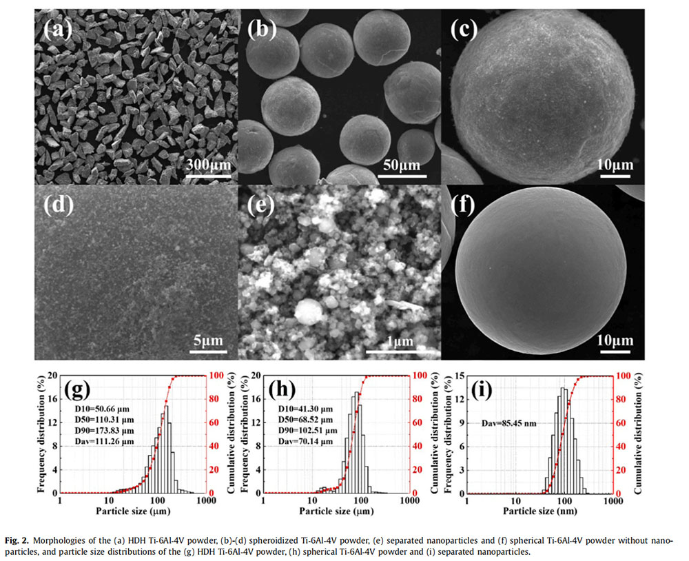 图2a和b分别显示了HDH Ti-6Al-4V粉末和球化Ti-6Al-4V粉末的形貌。可以看出,经过等离子球化处理后,有棱角的Ti-6Al-4V颗粒转变为球形,表面有一层连续的颗粒层。图2c和d为纳米颗粒附着球形Ti-6Al-4V粉末的高倍照片,可以看出该层由大量细小颗粒组成。为了明确细小颗粒的结构,将它们从球化后的Ti-6Al-4V粉末中分离出来。分离出的细颗粒的形貌和粒度分布分别如图2e和i所示。可以看出,细颗粒主要由粒径均匀的球形纳米颗粒组成,纳米颗粒的平均粒径为85.45nm。分离后的球形Ti-6Al-4V粉末的形貌如图2f所示。显然,分离后的球形Ti-6Al-4V粉末的表面比纳米颗粒附着的球形Ti-6Al-4V粉末更光滑。因此,分离过程也可用于去除等离子体球化过程中产生的细小颗粒。球形 Ti-6Al-4V 粉末的粒度分布如图 2i 所示。与角状 HDH Ti-6Al-4V 粉末(图 2g)相比,球形 Ti-6Al-4V 粉末的粒度分布更窄,且粒度分布更均匀。角状 HDH Ti-6Al-4V 粉末和球形 Ti-6Al-4V 粉末的平均粒度分别为 111.26 µm 和 70.14 µm。粒度的快速减小表明等离子球化过程中熔滴发生了剧烈的汽化。剧烈的汽化可以为后续冷却过程中沉积在球形粉末表面提供足够的材料。