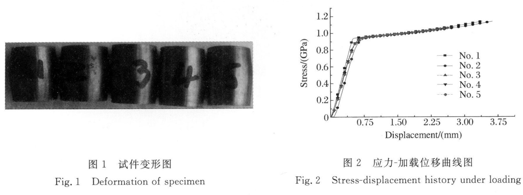 利用 MTS 材料实验机以1mm/min 的加载速度对直径为10mm、轴向长度为15mm 的圆柱形非退火状态 T a-10W 试件进行准静态压缩,经压缩后试件的变形如图1所示。从图1中可以看出,在准静态压缩过程中,试件呈鼓状变形,随着载荷增加试件变粗,在本实验中加载的最大载荷约为9t,此载荷使试件发生了明显的塑性变形,但还未达到试件破坏的载荷极限,试件表面没有明显的裂纹产生,说明试件材料具有良好的韧性。由实验测试计算得到的试件应力随加载头下降位移的关系曲线如图2所示,从图中可知,非退火状态 T a-10W 合金具有较高的强度,其准静态压缩屈服强度约为930MPa。