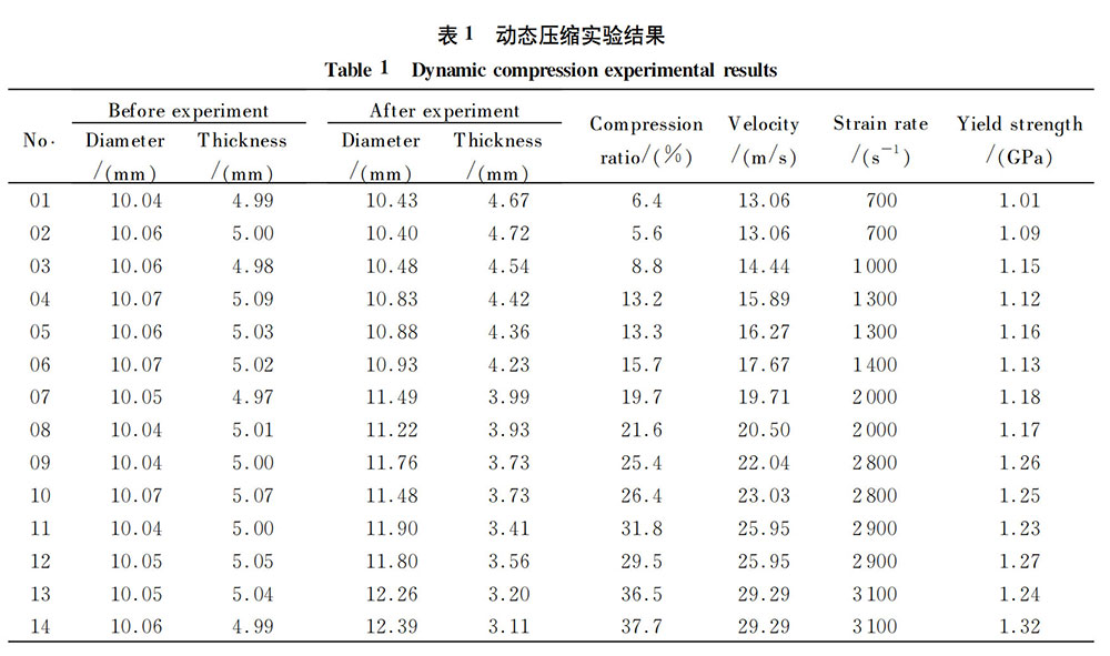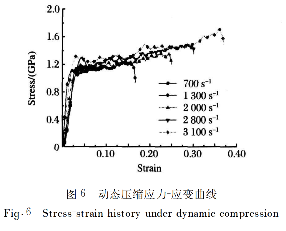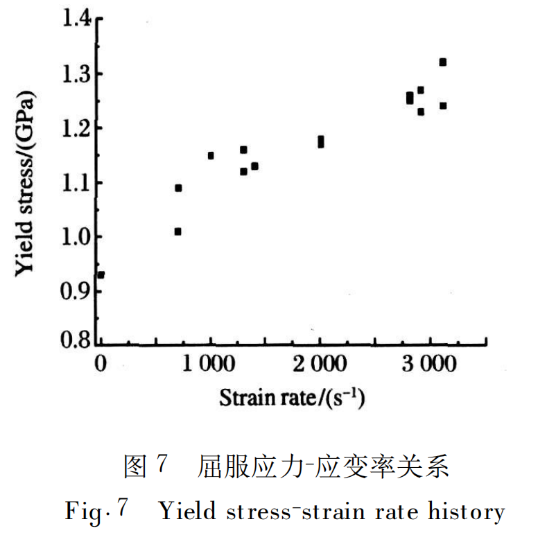 (2) 在应变率为700~3100s-1动态压缩实验中,材料的动态屈服强度由1?0GPa 增加到1?3GPa,屈服强度随应变率的增加而提高,具有率相关性。