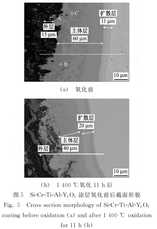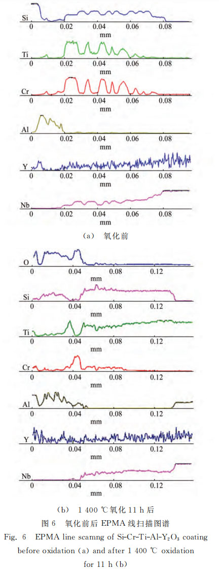 图5和图6为Si-Cr-Ti-Al-Y2O3 涂层氧化前后的截面形貌及成分线扫描图谱。表1为图5(a)中A、B、C的波谱成分分析结果。从图5(a)中可以看出,Si-Cr-Ti-Al-Y2O3 涂层 分 为3层,分 别 为 外 层、主体层和扩散层。其中,外层在图中衬度为黑色,颜色与酚醛树脂相近,对 A 处进行 EPMA 可知,该层由大量铝及少量(Cr,Ti)Si2 组成,厚度约为15μm。主体层厚度约为60μm,主要 由(Cr,Ti)Si2 及 Nb-Si2 构成,图5中灰色B区域主要是(Cr,Ti)Si2,图5中浅灰色 C 区 域 主 要 是 NbSi2。扩散层厚度约为11μm,主要成分为 Nb5Si3。 由图5可见,氧化后涂层表面变得凹凸不平,扩散层由11μm 增加至20μm。Si-Cr-Ti-Al-Y2O3 涂层的氧化过程同Si-Cr-Ti-W 涂层的类似,区别在于外层中的铝和硅在高温下与氧气反应生成主要成分为 Al2O3 和SiO2 的复 合 氧 化 膜[17],复合 氧 化 膜 致密、高温稳定性强,阻碍了氧元素的扩散。
