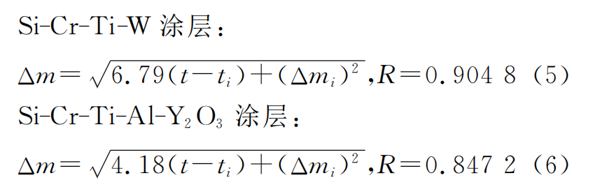 氧反应 生 成 SiO2 和 W5Si3,氧在 SiO2 和 W5Si3 中的扩散速率均较低;(2)熔烧过程中,涂层中的铝熔点低、活性高,形成的液相有助于烧结的进行,减少了表面缺陷的产生和硅元素的挥发;(3)Y2O3 颗粒分布于涂层基体中,熔烧过程中可作为形核中心,有利于晶粒的细化与涂层的致密化,减少孔洞和裂纹等缺陷的形成,提升了涂层的表面质量,进而提升了抗氧化性能[6]。从图7(a)中 还 可 以 看 出 添 加 铝、Y2O3 的效 果好于钨。这 是 因 为 铝 和 硅 同 氧 反 应 生 成 复 合 氧 化膜,该复 合 氧 化 膜 较 Si-Cr-Ti-W 涂层 的 纯 SiO2 氧化膜更致密,且复合玻璃膜热焓高、高温稳定性强、热膨 胀 系 数 适 中,因而涂层的抗氧化能力高于 Si-Cr-Ti-W 涂层。图7(b)、图7(c)显示(Δm)2与t均基 本 成 直 线关系,可判定两种改性涂层在1400 ℃的氧 化 曲 线遵循抛物 线 规 律。通 过 对 氧 化 数 据 拟 合,得 出 Si-Cr-Ti-W 涂层 和 Si-Cr-Ti-Y2O3 涂层 的 Kp 值分 别为6.79mg2·cm-4·h-1,4.18mg2·cm-4·h-1,代入式(4)得到两种涂层1400 ℃恒温氧化增重动力学方程见式(5)、(6):