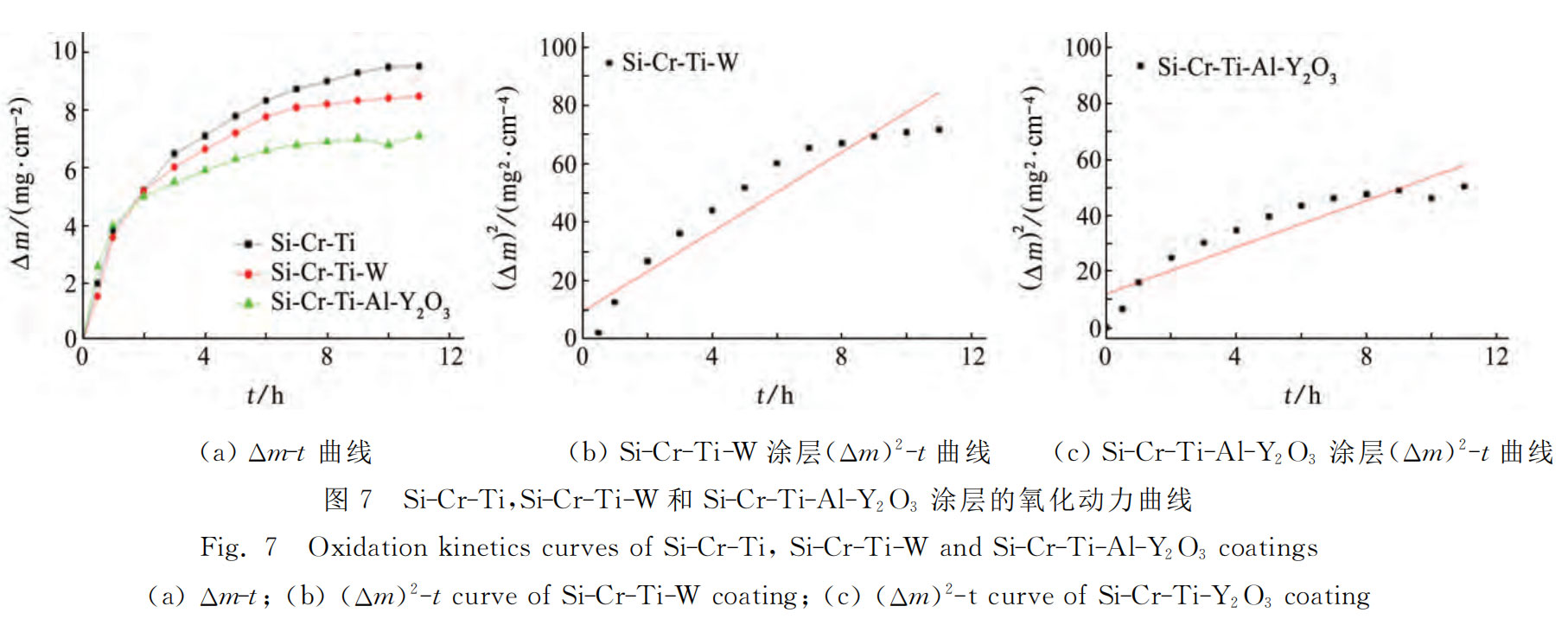 Si-Cr-Ti涂层、Si-Cr-Ti-W 涂层和 Si-Cr-Ti-Al-Y2O3 涂层在1400 ℃的 Δm-t关系曲线及(Δm)2-t关系曲线见图7。从图7(a)中可以看出,氧化可分为三个阶段。氧化初期(0~1h)增重较快,此 时 涂层中的硅、铝 等 同 氧 反 应 生 成 SiO2、Al2O3,形成 熔融状玻璃膜,但尚未完全覆盖表面。氧化中期(1~7h)增重速度减缓,此时熔融状玻璃膜完整覆盖基体,并随着时间延长不断增厚,显著降低了氧元素的扩散速率,涂层增重变缓。氧化后期(7~11h),由于熔融状玻璃膜较厚,氧元素扩散速率降低,涂层中的硅消耗量减少,氧化增重趋于稳定。三种涂层的单位面积增重在2h内差 别 不 大,但 是2h之后 添加了改性元素的涂层增重速率明显低于原始涂层。1400℃氧化11h后,Si-Cr-Ti涂层增重为9.56mg·cm-2,Si-Cr-Ti-W 涂层增重为8.34mg·cm-2,Si-Cr-Ti-Al-Y2O3 涂层增重为6.96mg·cm-2。可见向Si-Cr-Ti涂层 中 添 加 钨 和 铝、Y2O3 均能 够 提 升涂层的抗氧化性能。这是 因 为:(1)钨在 熔 烧 过 程中同硅反应生 成 WSi2,Alam 等[14,21]认为,WSi2 同