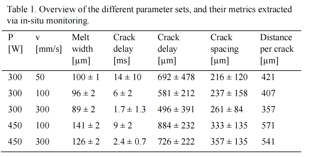 除一条出现纵向裂纹的轨迹(在相机视野之外)外,所有裂纹均为横向裂纹。这可以量化熔池尾端通过和裂纹出现之间的时间延迟(以毫秒为单位)(表1中的裂纹延迟[ms]),该延迟也可以转换为熔池后方的距离(表1中的裂纹延迟[µm])。由于许多视频显示存在多条裂纹,因此还可以提取裂纹之间的距离(表1中的裂纹间距[µm])。通过将轨迹总长度除以裂纹总数(表1中的每条裂纹距离[µm]),对扫描轨迹进行后部检查,可以得出一个包含类似信息的指标。然而,最后一个指标没有考虑端部效应(轨迹的起点和终点)。