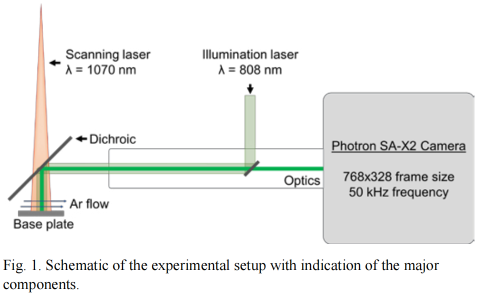高速成像平台此前已在参考文献[17]中描述。使用 Photron SA-X2 高速摄像机拍摄高速视频。帧尺寸为 768x328 像素,帧频为 50 kHz,相当于 620x265 µm 的视场。视场固定,激光扫描图像。快门速率设置为最低,以降低熔池辐照度。实验装置如图 1 所示。Chroma 二向色滤光片允许所有 1000nm 以上的波长通过,通过将用于成像的波长反射至摄像机,实现自上而下的视觉效果。光学系统包括安装在 Navitar 显微镜机身上的三丰 (Mitutoyo) 10 倍显微镜物镜(数值孔径 0.28,光学分辨率 1 µm),采用 Cavilux HF 500 W 低相干激光源(λ = 808nm)同轴照明,脉冲频率为 1µs,并在相机前放置一个 810 nm 带通滤光片,以进一步避免熔池中其他波长的辐射使图像饱和。氩气以 0.5 l/min 的速率自由流过底板。使用波长为 1070 nm 的 JK FL600 Yb:玻璃纤维激光器以连续波模式运行,最大输出功率为 600 W,光束直径为 50µm 1/e2,用于扫描钨板上 2 mm 长的单个矢量。 2毫米厚的钨板采用线切割技术切割自一根由Eagle Alloys Corporation提供的直径25.4毫米、纯度>99.95%的钨棒,之后用600目SiO2砂纸对表面进行部分打磨。制造商报告的钨板氧含量为30 ppm。使用Keyence VK-X1003D激光扫描显微镜进行正交分析。对裂纹进行表面后部检查。使用表1中的五个参数组合,分别扫描了10条2毫米长的线。