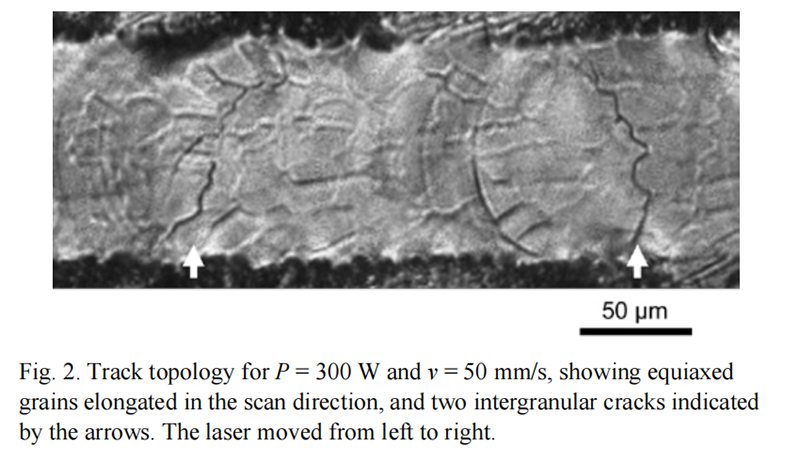 在未来的工作中,我们将结合高速视频监控和热模型,以估算熔池后方(特别是在出现裂纹的区域)的温度分布,并阐明微裂纹对增加的激光功率和较低的扫描速度的不同响应。我们将相邻地沉积多个轨迹,以确定重新加热和施加横向应变分量对第一条轨迹中现有裂纹以及新裂纹出现的影响。