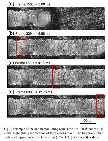 图3显示了四帧相机拍摄的图像,其中激光以v= 100 mm/s、P= 300 W的速度从左到右扫描。(a)和(b)中可以看到熔池。(b)-(d)显示了裂纹出现后不久的图像,裂纹位置以红色突出显示。大多数裂纹是瞬间出现的,使用50 kHz的帧速率无法确定裂纹的扩展速度。