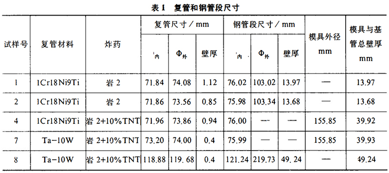 Ta-10W合金具有高熔点,很高的高温强度和极好的耐腐蚀性能等特点,适用于高温、高压、耐腐蚀、抗烧蚀的工作环境。采用爆炸复合技术使Ta-10W合金与钢相互复合形成复合板材或管材,则既能发挥Ta-10W合金的优点,又能降低成本。本工作是对Ta-10W合金衬管与CrNiMo钢管段的爆炸复合进行初步研究。
