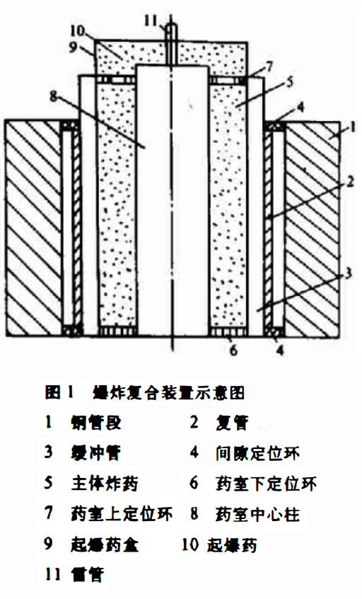 试验所用炸药是2号岩石硝铵炸药和加入了10 %TNT的2号岩石硝铵炸药两种,其爆速符合上述要求。圆管内复时药量的计算目前还没有准确的计算方法,一般是 根据装药质量比,计算出平板复合时的炸药厚度,再取其60%为圆管内复时炸药厚度为宜(3)。
