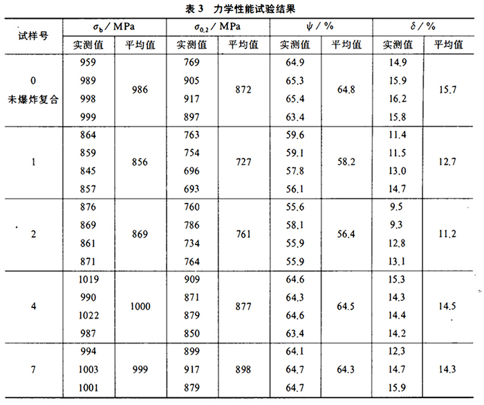 为分析爆炸复合前后基管材料力学性能的变化,从复合前后的管段样品上,沿母线取样加工成拉伸试样。试验结果如表3所示。从试验结果看出,1号和2号样品爆炸复合后内径变形量大,其强度和塑性均降低,即较大的内径变形量导致基管钢管段力学性能恶化。如果内径变形量控制在1%左右,则对管段样品的力学性能影响不大。这一结果说明在进行衬管内复爆炸复合时,必须控制内径变形量,否则将会导致基管力学性能下降。