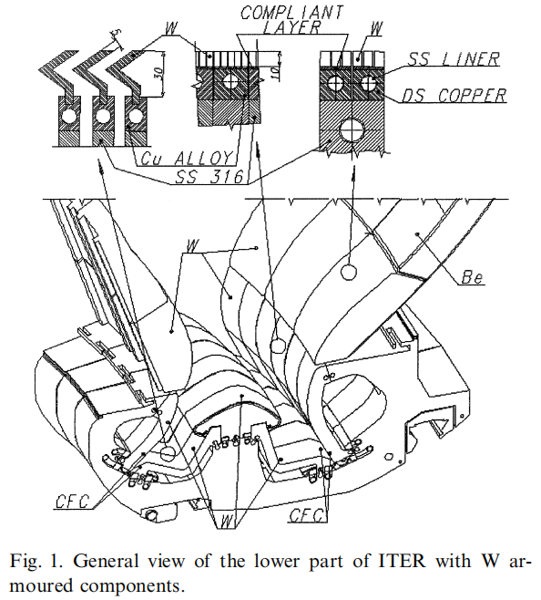 如前所述,钨被粘合在一个主动冷却的铜基体上。铜基体的进水温度标称值为140°C。根据热流密度的不同,铜和钨之间的界面温度可能在 160-20oC 左右,而钨表面温度可能在 200 至 1200oC 之间(见表 1)。由于两种材料之间的热膨胀系数差异(钨为 4 x 10-6/C,铜为 18 x 10-o/C),这种较大的温度变化会导致钨产生较大的应力。为了降低这些应力,人们正在研究各种制造方法。