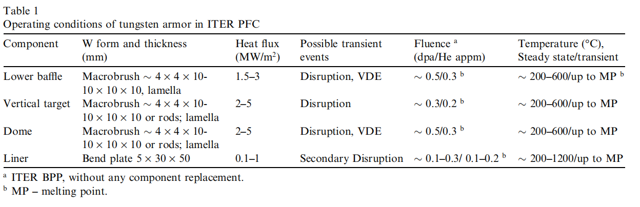 钨具有较高的物理溅射能量阈值(D 约为 200 eV),并且不会与氚形成氢化物或共沉积物。此外,钨在所有金属中熔点最高,蒸气压最低,导热性良好,且具有较高的高温强度。这些物理和机械性能使其作为高热通量组件涂层极具吸引力。图 1 显示了目前 ITER 等离子体面向组件 (PFC) 中考虑使用钨的区域。考虑的钨厚度范围为 4 至 30 毫米。表 1 比较了 ITER 等离子体面向组件不同部位钨的运行条件。从表中可以看出,圆顶和垂直靶将承受等离子体破坏的冲击,因此厚度需要达到 10 毫米左右;而衬里将承受等离子体破坏产生的二次能量。衬管中的钨具有双重功能。首先,衬管后方是泵送管道。衬管的设计旨在保护这些管道免受视线内粒子流的影响,因此其形状如图1所示呈Z形。其次,衬管表面温度约为500±1200°C,以防止在冷区出现碳共沉积。由于该区域的热负荷相对较低(<1 MW/m²),因此使用了较厚的截面(约为30 mm)来增加穿过材料的DT。在瞬态事件中,钨的表面温度可能会接近熔点。