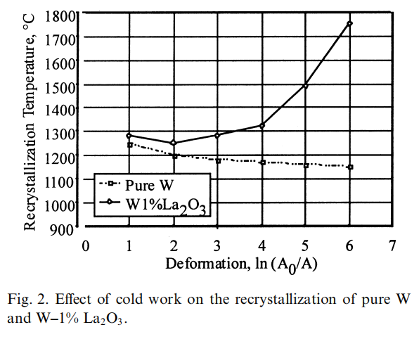 目前,ITER 应用考虑使用几种类型的钨:纯钨(压制/烧结/热加工)、弥散强化钨(机械合金化/压制/烧结/热加工)和铸造合金。粉末冶金生产的纯烧结钨是最易获得且最便宜的钨等级,但其再结晶温度较低。W-1% LazO3 的再结晶温度可以显著提高,细丝可高达 1700°C 以上。图2中W-1% LazO3合金的高再结晶温度是由于热机械处理过程中弥散相与位错相互作用的结果。热加工量越大,退火过程中形成的弥散相颗粒越细小。在再结晶过程中,这些颗粒阻止了二次晶粒的生长。此外,与纯钨相比,W-1% LazO合金在再结晶状态下具有显著更高的机械强度。
