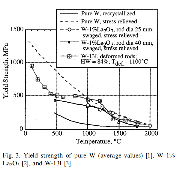 铸造钨是一种相对较新的产品。过去,由于铸造钨晶粒尺寸较大,通常过于脆性,无法加工成板材。然而,俄罗斯联邦最近开发了一种弱合金化钨(W-Mo-Y-Ti),命名为W-13I。该材料采用真空熔炼,然后进行冷变形生产。添加钇和钛等活性元素可减少游离氧和碳的含量,从而提高机械性能。这三种材料均表现出钨和其他体心立方金属典型的显著延性-脆性转变。这些材料的延性-脆性转变温度 (DBTT) 远高于室温,范围在 250°C 至 600°C 之间。