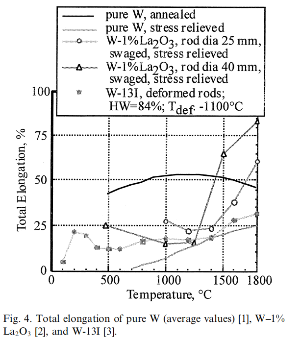 钨的机械性能与生产历史、合金元素、杂质和热机械处理有关。这种依赖关系可以在图 3 [1-3] 中看到。纯钨在退火/再结晶和应力消除条件下的数值是使用不同测试方法对不同材料进行测量的平均值。从该图可以看出,应力消除和再结晶粉末冶金钨之间存在显著差异。 W-1% LazO3 和 W-13I 的强度也介于两种条件之间。较高的值可能是由于测试程序和冷加工量的差异造成的。图 4 显示了这些材料的总伸长率数据。冷加工和应力消除状态下的纯钨比再结晶钨具有更高的强度和更低的延展性。应力消除状态下 W-1% LazO3 的总伸长率高于相同条件下的纯钨。对于 140oC 以上的温度,伸长率的差异略有误导性,因为一些应力消除材料一些钨已发生再结晶,而另一些则部分再结晶。重要的是,它们都具有延展性。
