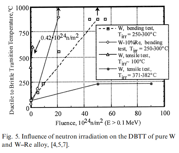 为了总结中子辐照对钨机械性能影响的数据,可以使用 DBTT 数据。DBTT 增加的幅度似乎取决于能量密度和辐照温度。中子辐照对纯钨和钨-10%铼合金的影响比较[4,5,7]表明,辐照会导致钨-10%铼合金更快速、更严重的脆化(见图5)。这项研究的结果有些令人惊讶:合金元素铼能够有效地将双相热裂解温度(DBTT)抑制到室温左右,并降低纯钨的可制造性和可焊性。基于这项研究以及在moimproves lybdenum中的类似研究,似乎这种合金元素对未辐照钨有益,但对辐照钨有害。这也是为什么ITER不考虑使用含铼合金的原因之一。