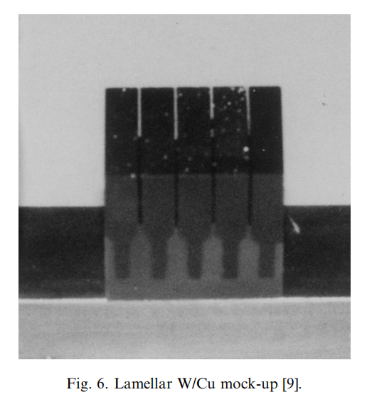 第二种方法是采用叶夫列莫夫研究所[9]正在开发的薄片型结构。该方法(如图6所示)使用5毫米厚的板,同样在钨板周围铸造纯铜。然后使用CuInSnNi填充金属将铸造组合体钎焊到铜合金散热器上。同样,通过在钨板周围包裹一层薄的软铸铜,可以降低键合线处的残余应力。此外,将铜铸造到钨板上的大极耳上可以大大增加键合表面积。该组合在15 MW/m²的电流密度和2150次循环下进行了测试。在钨板中观察到了细小的表面裂纹,并且由于过热,软铜板发生了过度蠕变;然而,接头处仍然保持着良好的键合。