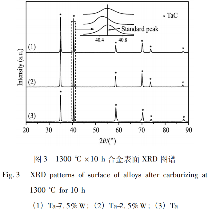 对1300 ℃渗碳10h 后Ta,Ta-2.5%W和 Ta-7.5%W 进行物相检测,如图 3 所示。分析可知,在本实验条件下,样品表层均生成了TaC,未检测到含W相。采用能谱分析( EDS) 进行成分分析后发现,渗碳层含有W元素。说明该实验条件下,C原子只与Ta发生反应,生成钽碳化合物,W仍作为溶质原子固溶于晶体内部。与纯Ta相比,Ta-2.5%W和 Ta-7.5%W 受溶质原子W的影响会导致XRD 图谱发生偏移。