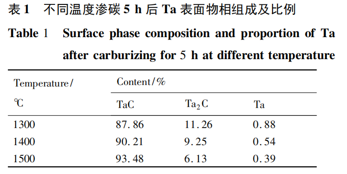 对不同温度渗碳5h,Ta 表面物相组成及所占比例进行分析,结果如表1所示。分析可知,1300℃渗碳5 h 后,Ta表面TaC 含量为 87.86%,1400 ℃ TaC含量为 90.21% ,1500 ℃ TaC 含量为 93.48% 。表明相同渗碳时间内,温度越高,表面生成的TaC所占比例越高。这是因为温度越高,C原子活性越大,有利于扩散反应的进行,因此在某种程度上可以促进 TaC的形成。
