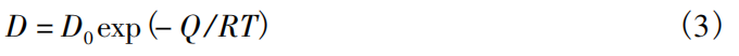 渗碳温度较低时,样品渗碳层厚度较小,因此本文对每个样品分别选取5个不同区域测量渗碳层厚度,以平均值作为实际渗碳层厚度,误差在 0.5~1.0 μm 之间。在 1300~1500 ℃范围内对样品进行5h渗碳处理,实验结果如图5所示。分析可知,提高渗碳温度,渗碳层厚度明显增加。从热力学的角度来看,影响扩散的主要因素是温度和扩散激活能,它们与扩散系数的关系如式( 3) 所示: