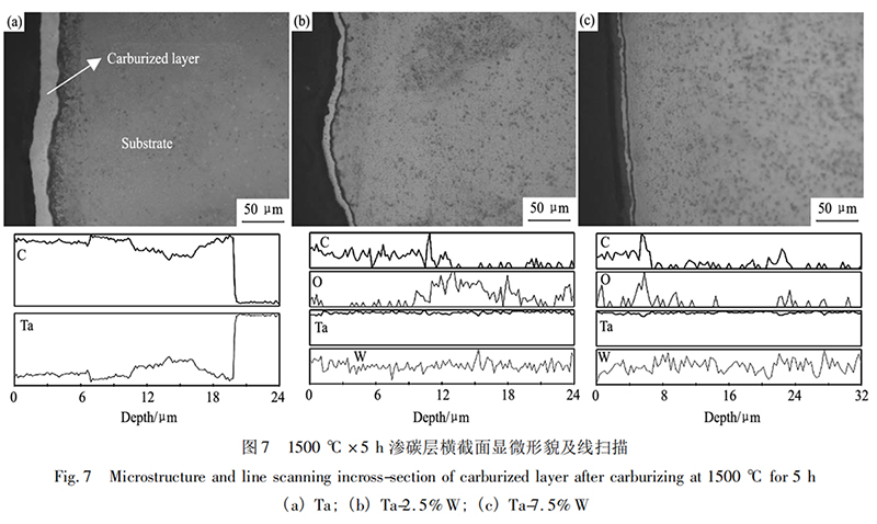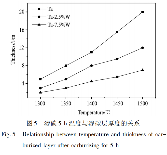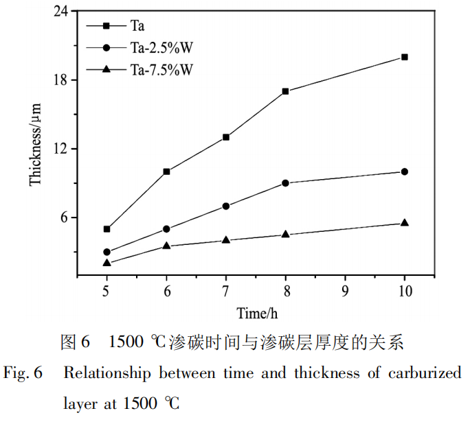 3. 元素 W 对钽钨合金渗碳过程具有阻碍作用,相同渗碳条件下,基体中W元素含量越高,渗碳速率越慢,获得的渗碳层厚度越小。