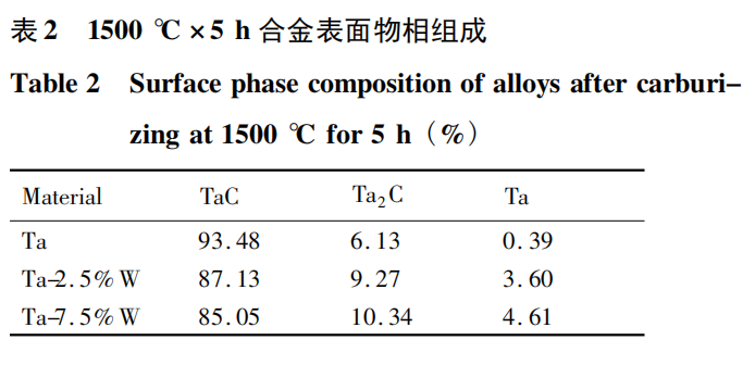 经1500℃ 渗碳 5h后Ta,Ta-2.5%W 和 Ta-7.5% W 横截面显微形貌如图 7 所示,下方是对应的线扫描曲线。分析可知,该实验条件下,Ta金属渗碳层厚度约20 μm,Ta-2.5% W 渗碳层厚度约10~12 μm,Ta-7.5% W 渗碳层厚度仅为7~8 μm。表明合金中 W 元素含量越高,渗碳后获得的渗碳层越薄。这一现象说明元素W对钽钨合金的渗碳过程具有阻碍作用。渗碳过程中C原子以间隙溶体的形式存在于晶格间隙中,再随着反应时间的延长,形成钽碳化合物。在Ta中添加W形成置换固溶体,溶质原子W的原子半径较小,会导致其周围的点阵收缩,平均点阵常数减小,晶格产生畸变,使得晶体结构中的晶格间隙发生变化。这种现象一方面会降低Ta合金中 C 原子的溶解度,另一方面导致 C 原子向Ta中扩散所需激活能大大增加。因此Ta基体中 W 元素的存在会阻碍C原子的扩散,随着W含量的增加,渗碳难度增大,获得的渗碳层越薄。对1500 ℃渗碳5 后Ta,Ta-2.5% W和 Ta-7.5% W 的表面物相组成及所占比例进行分析,结果如表 2 所示,渗碳层TaC与Ta2C的比例随 W 含量的增加而降低,再次证明钽钨合金中W元素的存在会阻碍扩散反应的进行。当渗碳时间延长至 10 h 时,表面均全部生成 TaC。说明在本实验条件范围内,合金元素 W 会减缓渗碳反应的进程,延长渗碳时间可以使钽钨合金表面与含C气氛充分反应,最终全部形成 TaC。
